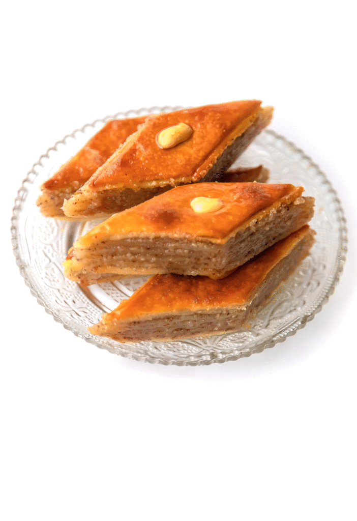 Indulge in our sweet, flaky pastry layered with nuts and honey.