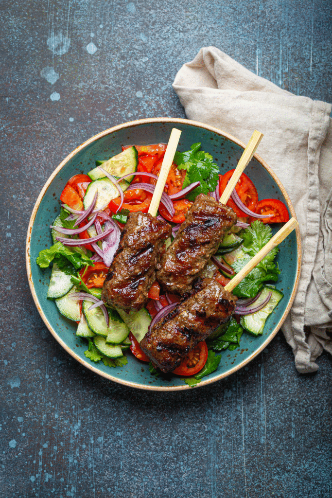 Grilled minced beef skewers seasoned with herbs and served with a creamy yogurt dip.